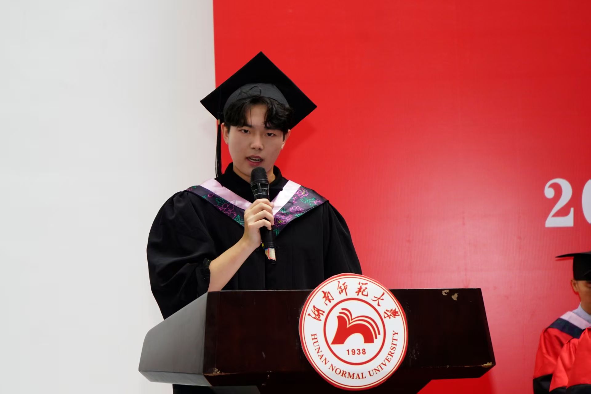硕士毕业生代表戴林格以“岳麓山下求索者”的身份,深情回忆了自己在工作室里的潜心钻研与图书馆中的挑灯夜读。她感恩导师如灯塔般的指引与同窗战友般的情谊,承诺以“画者的眼”洞察时代万象,以“匠者的心”雕琢艺术精品,在不同领域续写美院荣光。