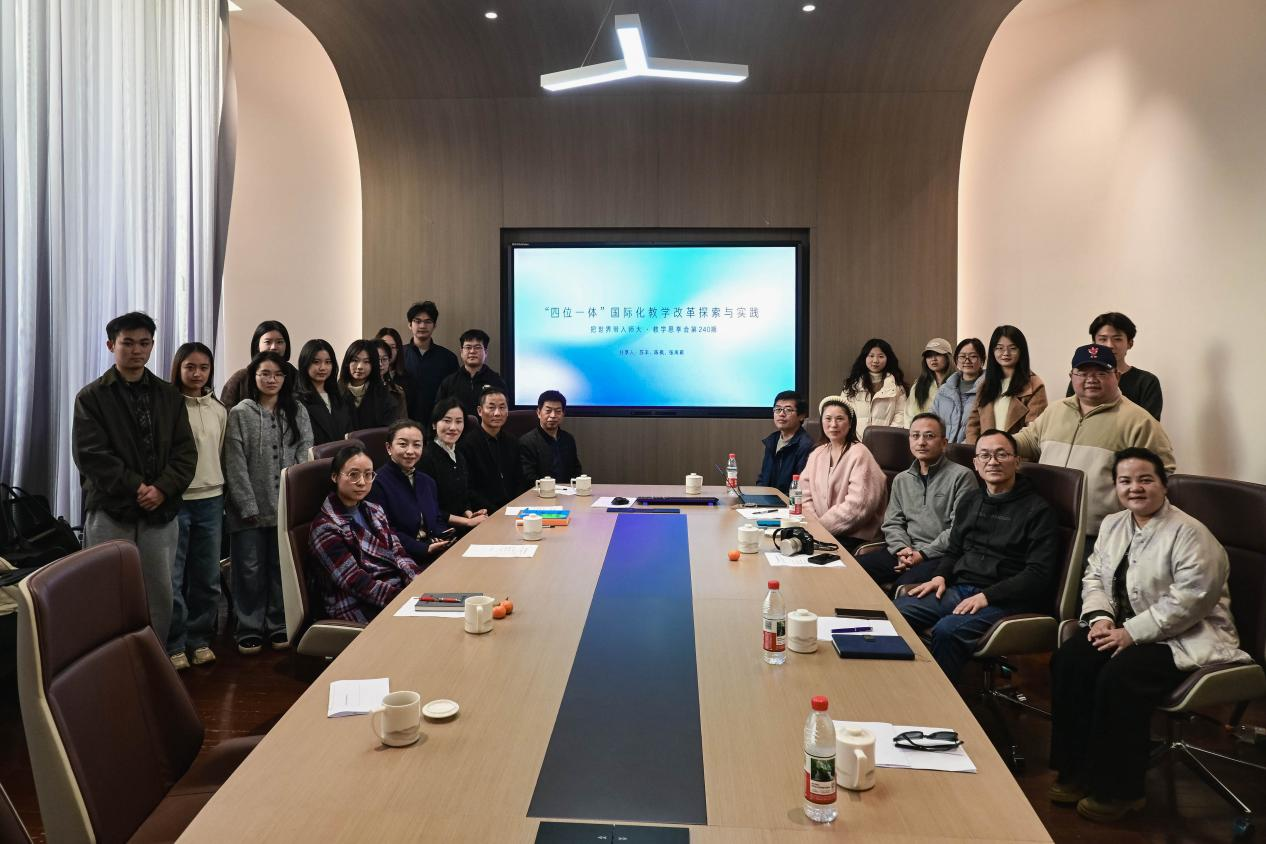 (通讯员:邵文婷,摄影:刘烨、丁婧萱、徐锦雯 )2025年12月19日15:00,美术学院第240期教师教学思享会在美术楼二楼会议室顺利举行。本次活动以“‘四位一体’国际化教学改革探索与实践”为主题,中德艺术设计学项目教学团队代表美术学院副教授、院长助理苏丰与副教授陈枫联合主讲。活动特邀教师教育学院教学能力发展科科长廖志华、加州州立大学视觉艺术系图形与交互媒体专业负责人王琛教授作重要点评与指导。美术学院副院长江波、数字媒体艺术系系主任鲁雯、艺术设计学系系主任刘京莎、湖南软件职业技术大学教师蒋乐娜以及学院各系部老师和学生共同参与了本次活动。