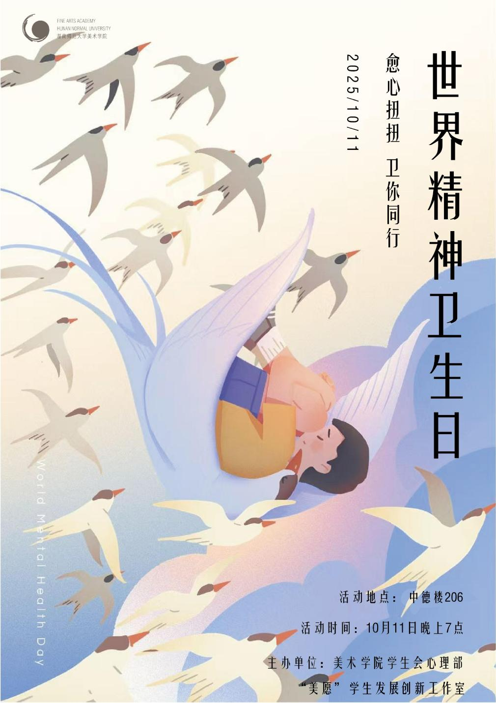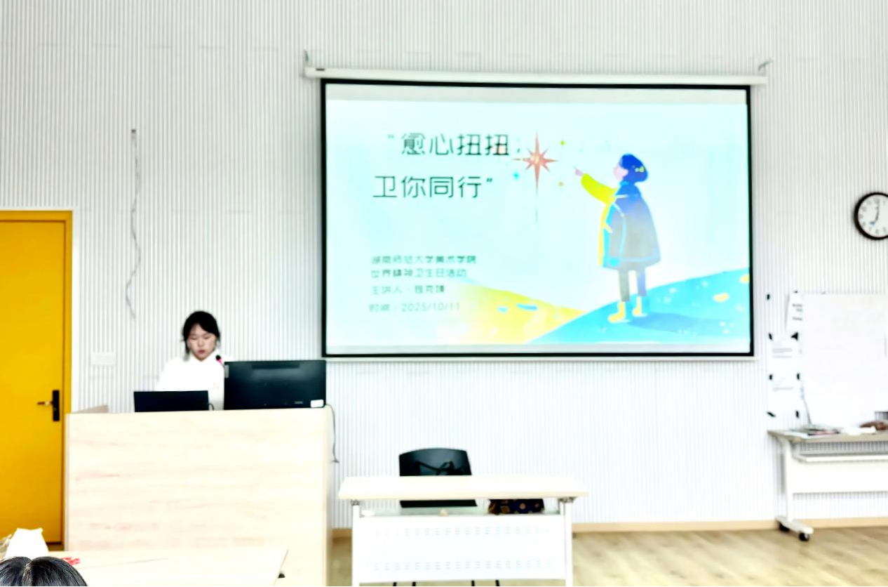 (通讯员 包克臻 叶子萱)2025年10月11日,美术学院在中德楼206教室成功举办“愈心扭扭,卫你同行”世界精神卫生日主题活动。本次活动由美术学院学生会心理部与“美愿”学生发展创新工作室联合策划,面向全院师生开展,旨在普及心理健康知识,营造积极健康的校园氛围。
