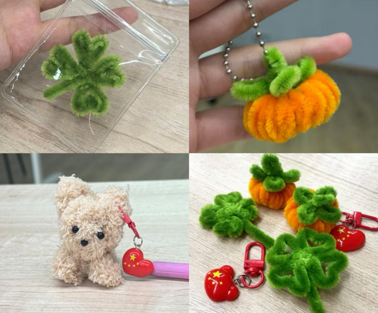 作为本次活动的核心环节,“扭扭棒DIY——扭走烦忧·指间生花”手工制作吸引了同学们的广泛参与。参与者分组制作四叶草、小柿子、小狗等造型,在动手过程中放松心情、缓解压力。完成作品后,同学们可选择个人留存或放入“幸运传递盒”,用于后续温暖传递活动。
