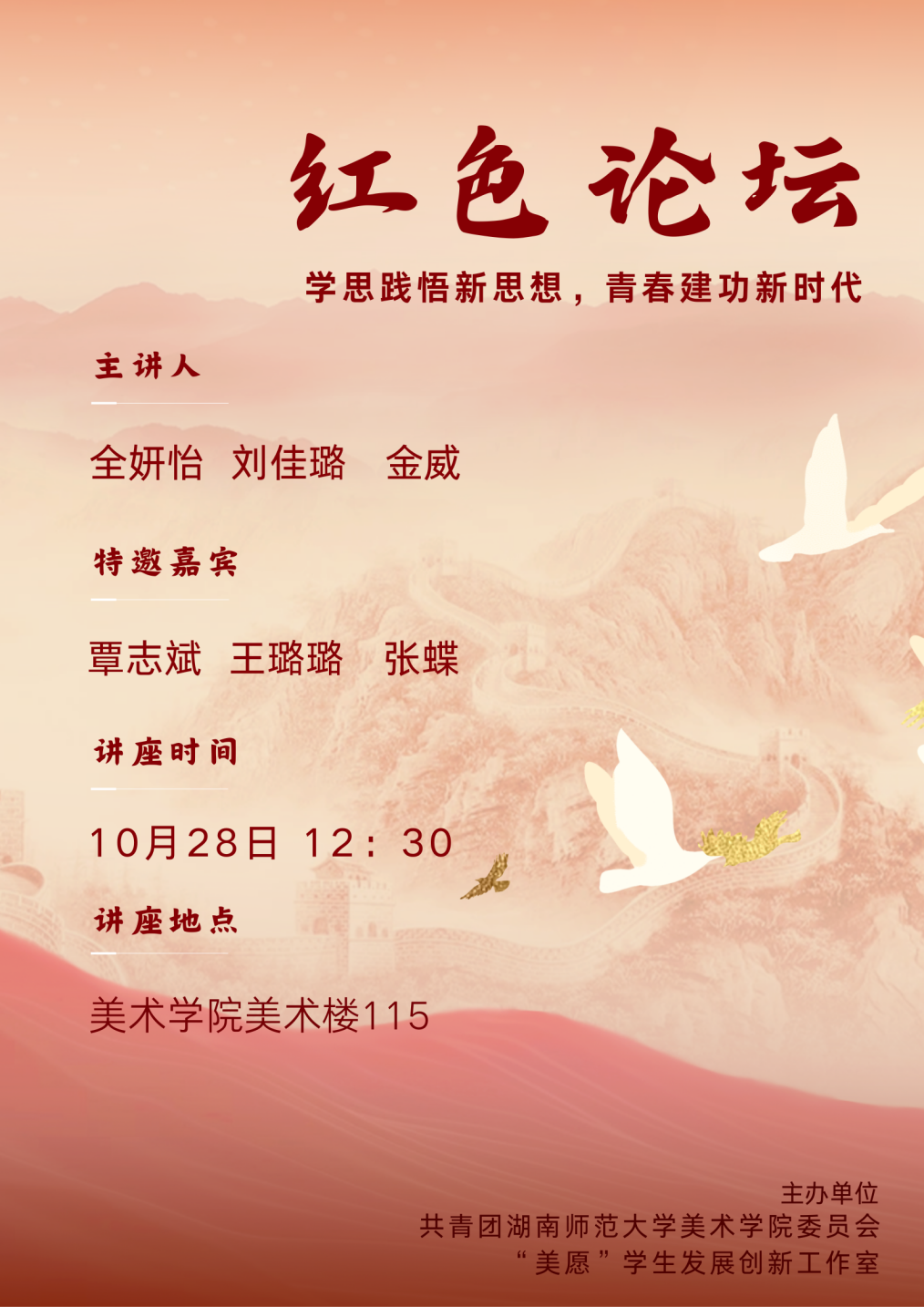 (通讯员 唐斯斯 蒋语卉 袁嘉俊)学思践悟,汲取榜样力量;青春建功,绘就时代新篇。10月28日中午,我院第807期红色论坛在美术楼举行。 院党委副书记覃志斌,院学工办主任、青年传媒中心指导老师、2024级辅导员王璐璐,院团委指导老师、2023级辅导员张蝶出席。团委办公室负责人何思颖主持。